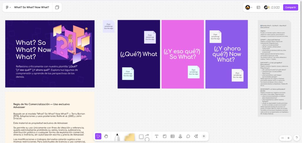La Plantilla “¿Qué? ¿Y eso qué? ¿Y ahora qué?” es una herramienta de reflexión crítica diseñada para ayudar a equipos y personas a aprender de experiencias pasadas y perfeccionar sus estrategias para futuros proyectos. Al igual que los 5 porqués, este modelo fomenta una exploración profunda de las acciones pasadas para descubrir qué funcionó, qué no y por qué. Su marco de tres pasos permite un análisis objetivo y la creación de un plan de acción constructivo para garantizar mejores resultados en situaciones similares.